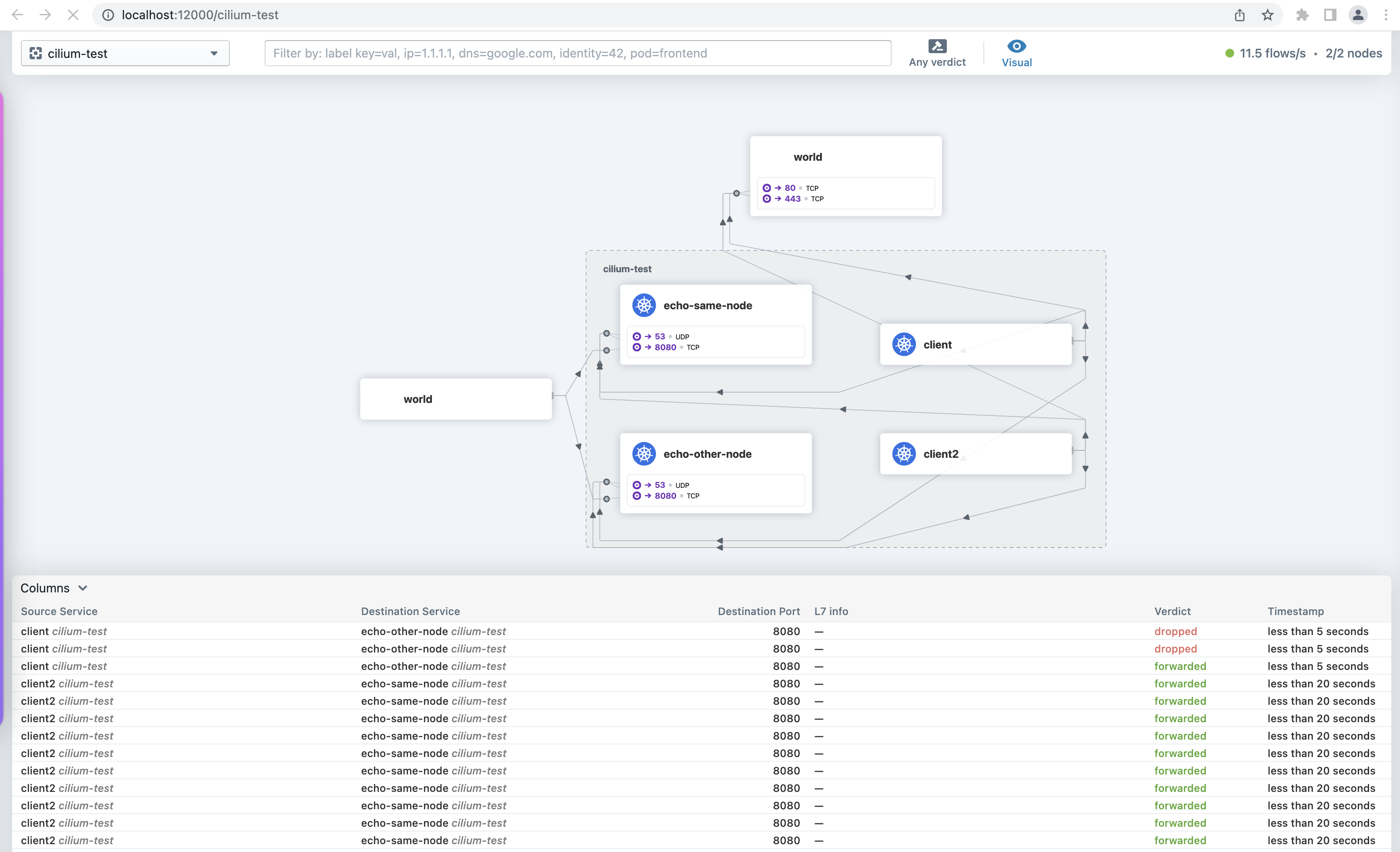 在界面左上角,选择 cilium-test namespace,查看 Cilium 提供的测试流量信息。