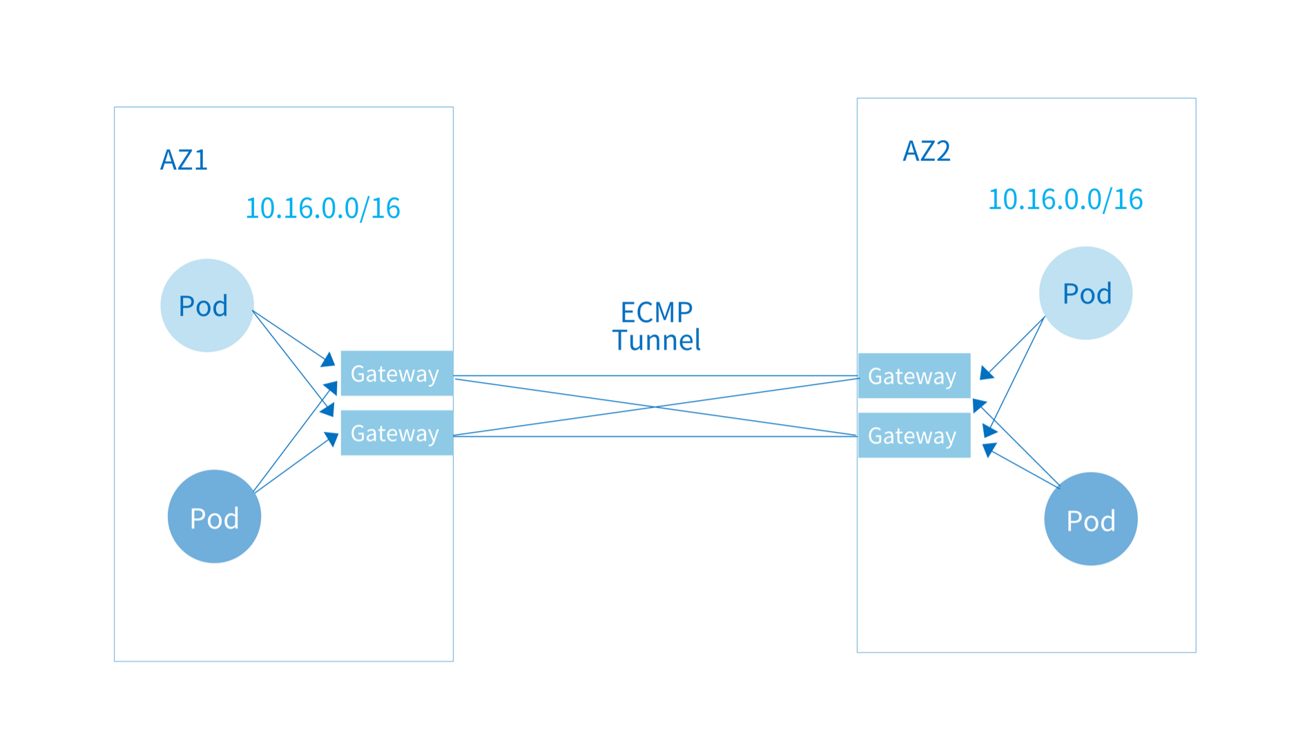 该模式的多集群互联为 Overlay 网络功能,Underlay 网络如果想要实现集群互联需要底层基础设施做网络打通。